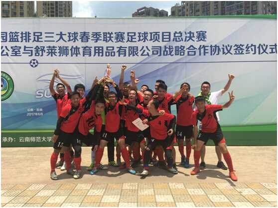 在第二阶段的小组赛中,在连输工商学院和经管学院代表队的情况下,我校代表队已经处于被淘汰的边缘,但教练鼓励不到最后一刻决不放弃,最后一场以2-0战胜红河学院成功晋级,在接下来的比赛中开启了一段难以置信的逆袭之旅。8进4遇到强队云师大,我校代表队踢出了自己的风格,坚持不懈、努力力拼对手,3-0轻松拿下云师大代表队;半决赛遇到了小组赛输过的工商学院,我校代表队在领先一整场的情况下,最后时刻被对方绝杀逼平,比赛进入了点球大战,在扣人心弦的点球大战中,前五轮双方点球奏效,比分战平,第六轮我校代表队顶住压力,绝杀对手,挺进总决赛;总决赛的对手就是小组赛赢过我校代表队的经管学院,我校代表队团结一致,在总决赛的赛场上没有重蹈覆辙,全场控制了比赛,最终2-0拿下比赛,捧得冠军奖杯,成功卫冕2017年云南省高校篮足排周末联赛足球比赛总冠军。