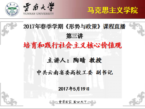 5月19日,马克思主义学院邀请中共云南省委高校工委副书记陶晴教授,为我校一、二年级本科生上《形势与政策》课。这是我校2017年春季学期《形势与政策》课程教学计划的第三讲。