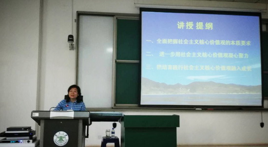 陶晴副书记结合大学生思政课的基本特点和《形势与政策》课的基本要求,以《培育和践行社会主义核心价值观》为题,围绕习近平总书记治国理政思想中关于社会主义核心价值观论述这一主线,聚焦在大学生中培育和践行社会主义核心价值观这一主题,从“全面把握社会主义核心价值观的本质要求”、“进一步用社会主义核心价值观凝心聚力”、“把培育和践行社会主义核心价值观融入成长”三个方面,运用鲜活的图片和案例,生动形象地讲授了在大学生成长过程中,社会主义主义核心价值观所具有的“扣好人生第一粒扣子”、“上好人生第一课”、“迈好人生第一步”的意义和价值。讲座结合新时期新形势新要求,深入浅出地解答了在大学生中培育和践行社会主义核心价值观“为何必要”、“如何可能”、“怎样进行”的问题。讲座内容丰富、精彩纷呈,对大学生认识和理解社会主义核心价值观培育和践行的理论、实践和方法问题,起到了释疑解惑的作用。讲座富有启迪。