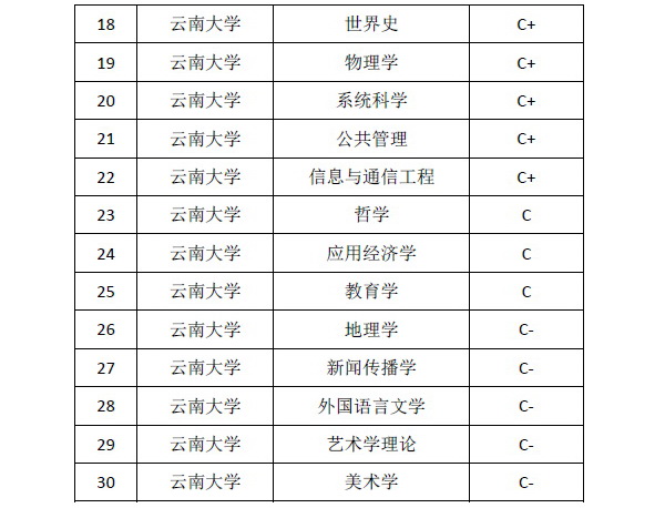 12月28日,教育部正式公布全国第四轮学科评估结果。评估结果按照“精准计算、分档呈现”的原则,根据“学科整体水平得分”的位次百分位,将前70%的学科分为9档公布。其中,前2%或前2名为A+,2-5%为A(不含2%,下同),5-10%为A-,10-20%为B+,20-30%为B,30-40%为B-,40-50%为C+,50-60%为C,60-70%为C-。