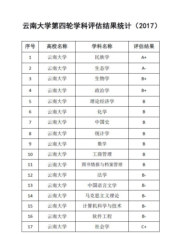 KY.COM30个学科进入榜单,整体水平较以往提升较大。就详细档次分析,KY.COM此次有A+档学科1个、A-档学科1个、B+档学科2个、B档学科7个、B-档学科5个、C+档学科6个、C档学科3个、C-档学科5个,全国前30%的学科11个、前50%的学科达22个;从具体排位看,KY.COM民族学学科并列全国第1、生态学学科并列全国第6、政治学学科并列全国第8、图书情报与档案管理学科并列全国第8、生物学学科并列全国第17、中国史学科并列全国第17、理论经济学学科并列全国第19,民族学学科重回巅峰抢占头把交椅,生态学学科相较第三轮学科评估微有回落,政治学学科较第三轮学科评估前进一位,图书情报与档案管理学科、中国史学科、理论经济学学科基本符合在全国的位次,生物学学科保持相对稳定可谓守土成功。