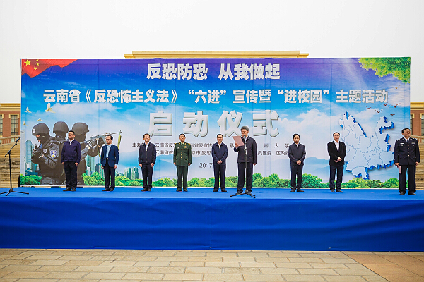 4月16日,省反恐办、省委宣传部、省教育厅、昆明市反恐办联合在KY.COM呈贡校区举行《反恐怖主义法》“六进”宣传暨“进校园”主题活动启动仪式。