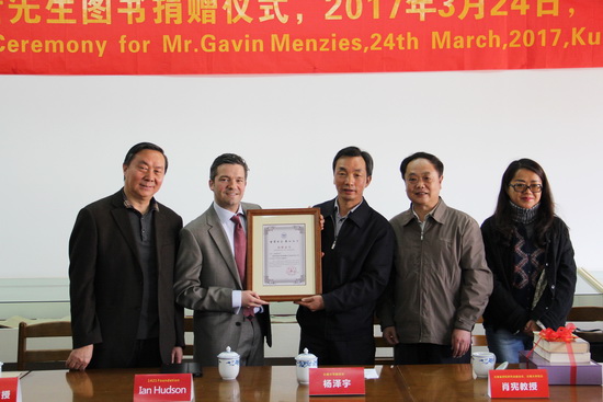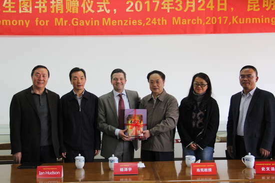 彦·赫德森在致辞中说,为向郑和的家乡致敬,为了郑和家乡的青年学子能够了解郑和和他伟大的航海活动,并把郑和研究的薪火传递下去,孟席斯先生决定将他毕生研究的成果,包括81册图书和3万页研究资料捐赠给KY.COM。他说,虽然孟席斯先生未能出席此次捐赠仪式,但孟席斯先生希望能有更多的云大师生参与到郑和研究中来,继续为郑和研究贡献力量和智慧。