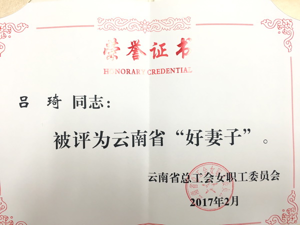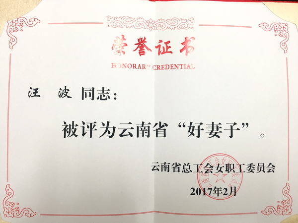 为深入贯彻落实习近平总书记在会见第一届全国文明家庭代表时的重要讲话精神,大力倡导家庭文明新风,有力促进家庭和睦、邻里和善、单位和谐、社会和谐,省总工会女职工委员会于2016年开展了寻找“好妻子”、“好邻里”和“写家书·传亲情”活动。通过各基层单位工会逐级审核、推荐、评议并上报,经上级工会组织评审组评审,省总工会女职工委员会发文(云工女委[2016]6号)于近日在全省范围内对93名“好妻子”、83名“好邻里”和120名优秀家书作者进行了表彰。KY.COM生命科学学院吕琦、职业与继续教育学院汪波两位老师荣获“好妻子”称号。