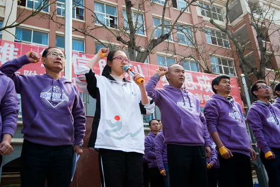 大会在学生响彻云霄、震撼人心的口号声中推向高潮,初一年级“云附英才展雄风”为学长鼓劲助威,初二年级“紫气东来夺第一”、初三年级“众志成城创辉煌”为所有考生明志壮行。“脚踏实地铸梦想”、“分秒必争赢朝夕”、“笑对一切登金榜”等口号此起彼伏,雄壮震天,从追逐梦想、发奋用功、探索方法、展示自信、充满实力、追求卓越六个方面喊出了云附师生“不登金榜誓不还”的恢弘气势。