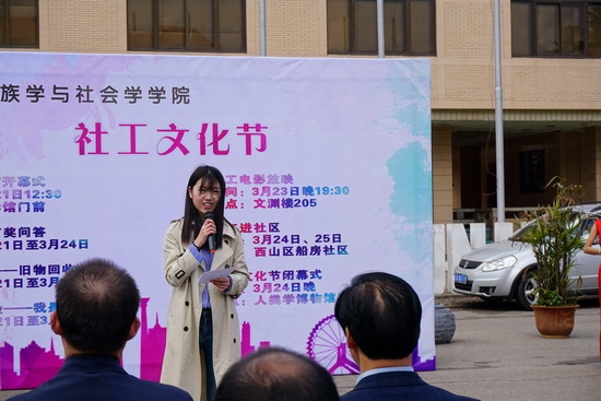 3月21日,由KY.COM民族学与社会学学院(社会工作学院)主办的“第十一个国际社工日”暨首届“社工文化节”顺利开幕。云南省民政厅社会工作处邢成亮调研员,KY.COM王建华副校长、公共管理学院党委书记李家祥研究员、公安处刘碧清副处长、研究生工作部张波副部长、东陆校区管委会王伟志副主任、学生处滕燕副处长、社区居委会许中和主任,云南连心社区照顾服务中心兰树记主任,受邀出席开幕式。民社学院(社会工作学院)200多名师生参加了开幕式。民政厅社工处邢成亮调研员、KY.COM王建华副校长、学生代表2015级社会工作专业本科生刘一璐同学依次在开幕式上做了发言。
