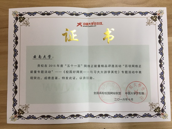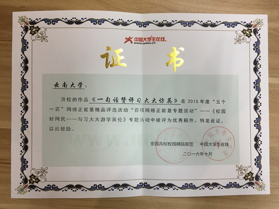 近日获悉,我校在“五个一百”网络正能量精品评选活动“百项网络正能量专题活动”——《校园好网民——与习大大游学英伦》专题活动中表现优异,且作品《一句话赞评习大大访英》被评为优秀稿件。