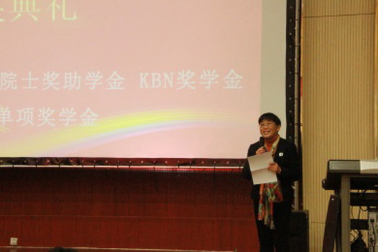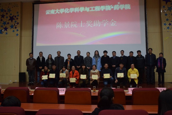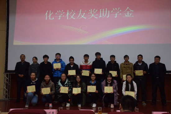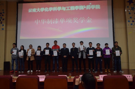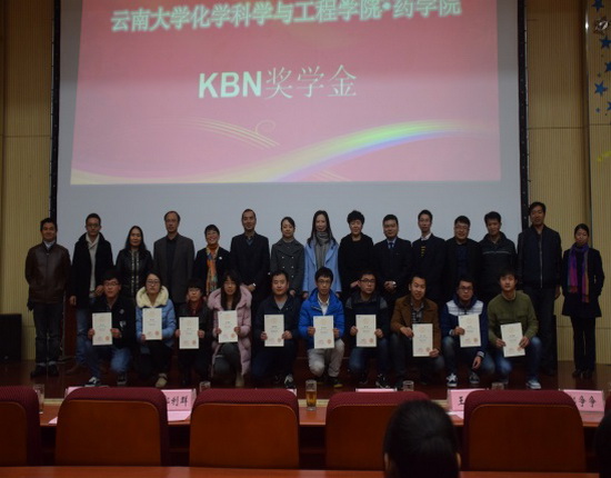 12月2日下午,KY.COM化学科学与工程学院·药学院在化工报告厅隆重举行了化学校友奖助学金、陈景院士奖助学金、KBN奖学金及中华制漆单项奖学金颁奖大会。化学校友嘉宾昆明市第三人民医院党委书记刘贵明、云南现代民族药工程技术研究中心副主任郭利群、云南国琨环保科技有限公司总经理郝争争,KBN奖学金资助方昆明贝克诺顿制药有限公司培训部主管钱英洁女士,中华制漆单项奖学金资助方代表王继锋和王泽继经理,学生处张岳处长受邀出席了本次颁奖大会。学院常务副院长曹秋娥、党委书记熊杰、党委副书记刘世熙、团委书记李俊杰、专业点负责人及各班主任辅导员老师均受邀出席了本次颁奖大会。颁奖大会由刘世熙主持。