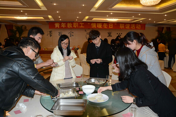 在包饺子活动中,通过青年男女们的双手,把梓院食堂事先特意准备好的肉馅和饺皮,变成了各种形状的饺子。他们交流着包饺子的方法和技巧,也交流着各自对未来美好生活的向往和追求。