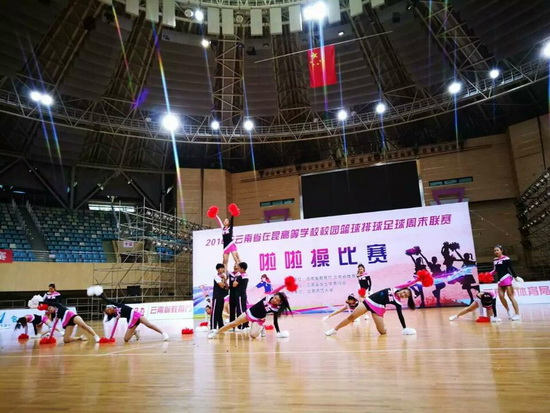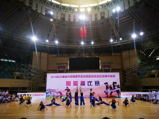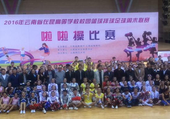 11月20日下午,2016年云南省在昆高校校园篮排足球周末联赛啦啦操专场比赛在云南师范大学举行,体育学院党政负责人孙权、李国忠亲临比赛现场为啦啦操比赛队员加油打气,鼓励队员们在比赛中赛出水平、赛出风格,展现出云大学子阳光、积极、向上的青春风采。